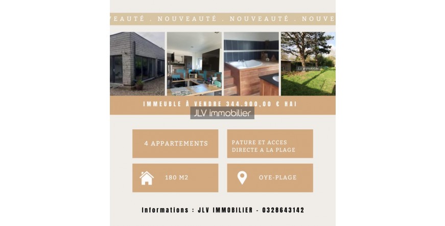 À vendre : Immeuble d'exception avec accès direct à la plage Découvrez cet immeuble entièrement rénové il y a 10 ans, offrant un cadre de vie unique avec accès direct à la plage, idéal pour les amoureux de la mer et des activités en plein air. Caractéristiques de l'immeuble : Quatre appartements de plain-pied avec jardins privatifs, parfaits pour profiter des journées ensoleillées. Pâture de 6000 m² avec boxes, idéale pour les passionnés d'équitation, avec un accès direct à la plage pour des balades à cheval inoubliables. Détails des appartements : 1er Appartement meublé de 26 m² (F2) : Libre d'occupation, possibilité de location RBN ou saisonnière. 2e Appartement de 30 m² : Loué avec bail meublé d'une durée d'un an, loyer de 550 euros. 3e Appartement de 23 m² : Loué avec bail meublé d'un an, loyer de 550 euros. 4e Appartement de 105 m² (Type F3) : Avec sauna et jacuzzi, loyer de 1000 euros (bail meublé d'un an), possibilité de récupérer le logement. Opportunité unique pour un investissement locatif ou pour vivre dans un cadre idyllique tout en bénéficiant de revenus locatifs. Ne laissez pas passer cette chance de posséder un bien d'exception au bord de la mer ! Pour plus d'informations ou pour organiser une visite, n'hésitez pas à nous contacter. Les coûts sont estimés en fonction des caractéristiques de votre logement et pour une utilisation standard sur 5 usages (chauffage, eau chaude sanitaire, climatisation, éclairage, auxiliaires) voir p.3 pour voir les détails par poste. Estimation des coûts annuels d’énergie du logement entre 2850€ et 3910€ par an Prix moyens des énergies indexés sur les années 2021, 2022, 2023 (abonnements compris) Les informations sur les risques liés à ce bien est exposé sont disponibles sur le site Géorisques : www.georisques.gouv.fr Dont 4,52 % TTC d'honoraires à la charge de l'acquéreur inclus dans le prix affiché. JLV IMMOBILIER, agences familiales à Dunkerque et Gravelines, met son expertise au service de vos projets immobiliers depuis 2008. Forte d’une équipe professionnelle d’une dizaine de collaborateurs et d’une parfaite connaissance du marché local, notre agence vous accompagne à chaque étape : estimation, vente, achat, investissement, location et gestion locative. Pourquoi nous choisir ? - Estimation gratuite et personnalisée sous 24 heures. - Plus de 1 500 ventes déjà réalisées. - Diffusion de vos annonces sur des supports locaux, nationaux et internationaux. - Mise en relation avec des établissements financiers et des entreprises locales sélectionnées pour travaux et maintenance. - Un accompagnement complet, du conseil à la finalisation de votre projet. Biens proposés : maisons, appartements, villas, propriétés de caractère, terrains, locaux commerciaux et professionnels. Propriétaires, vendeurs, acheteurs, locataires ou investisseurs — parlons de votre projet : https://www.jlv-immobilier.fr